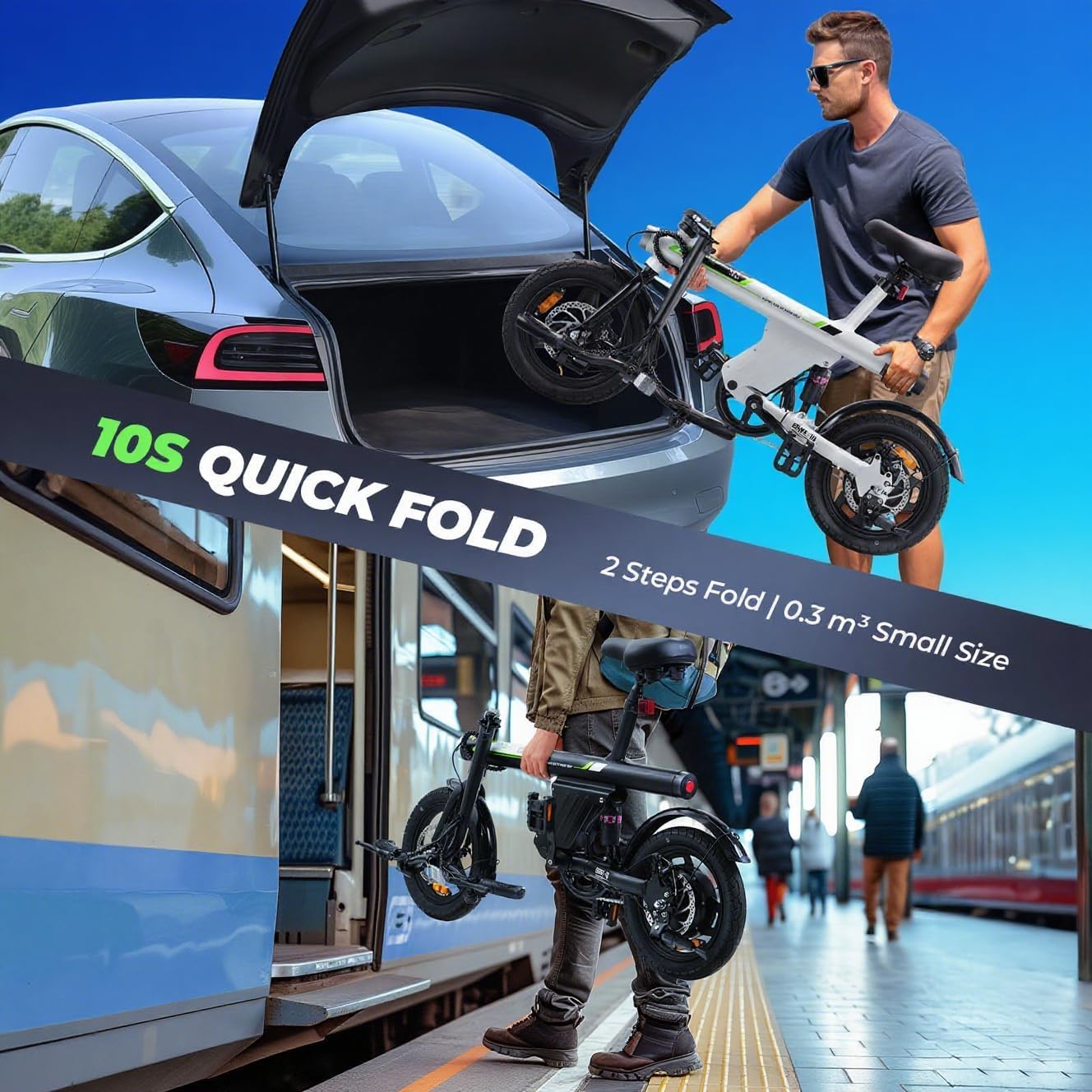 - Ultra-Compact Design:The ultimate space-saving ebike! Foldable handlebars, collapsible pedals and adjustable seating allow easy storage in car trunks, elevators, and small spaces - occupying less than 0.15m³ of space