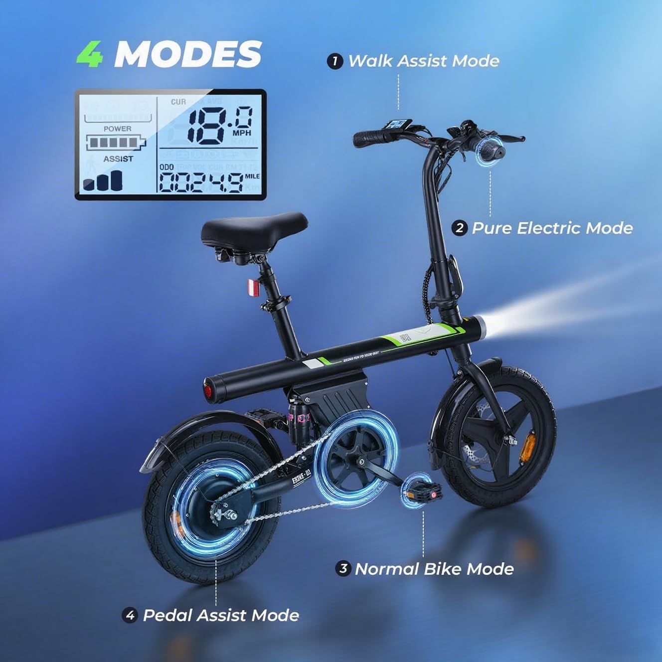 - 3-Mode Versatile Electric Bicycle: Choose your perfect ride: Pure Electric mode for effortless cruising, Pedal Assist mode with adjustable support, or Traditional mode for exercise. This complete e-bike system adapts to your every need