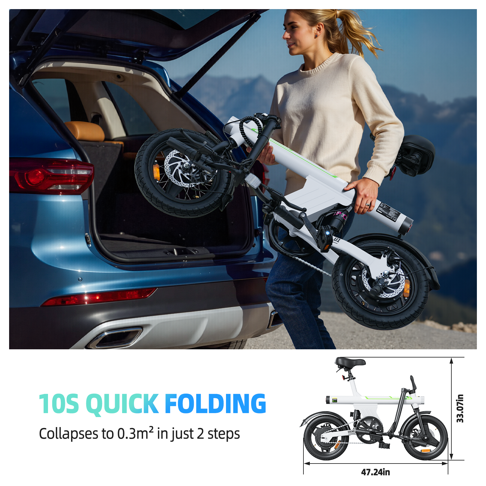 - Ultra-Compact Design:The ultimate space-saving ebike! Foldable handlebars, collapsible pedals and adjustable seating allow easy storage in car trunks, elevators, and small spaces - occupying less than 0.15m³ of space